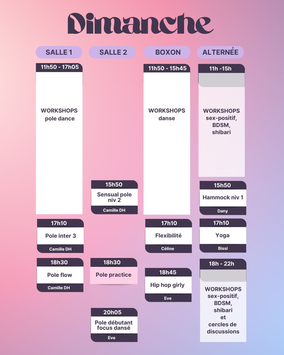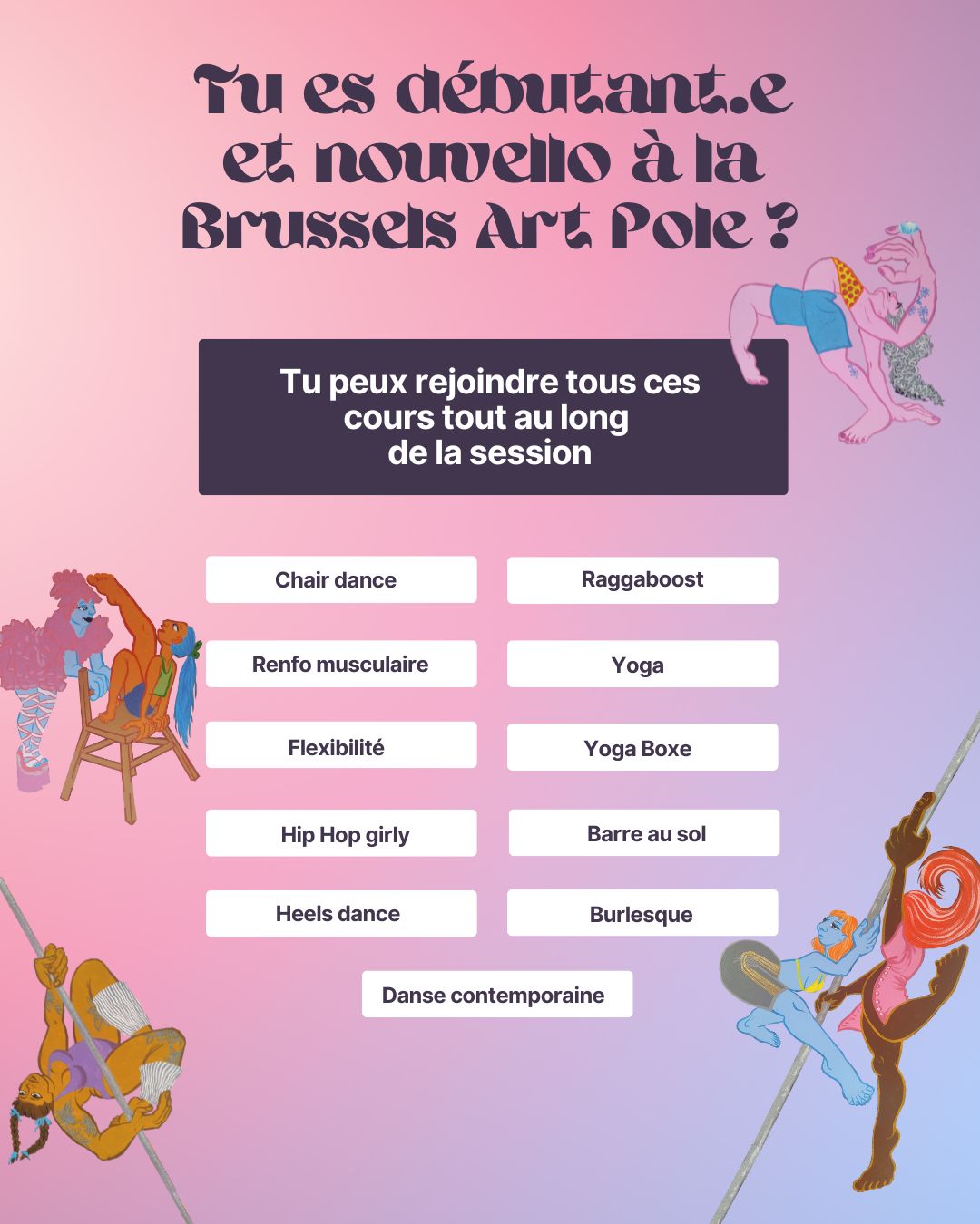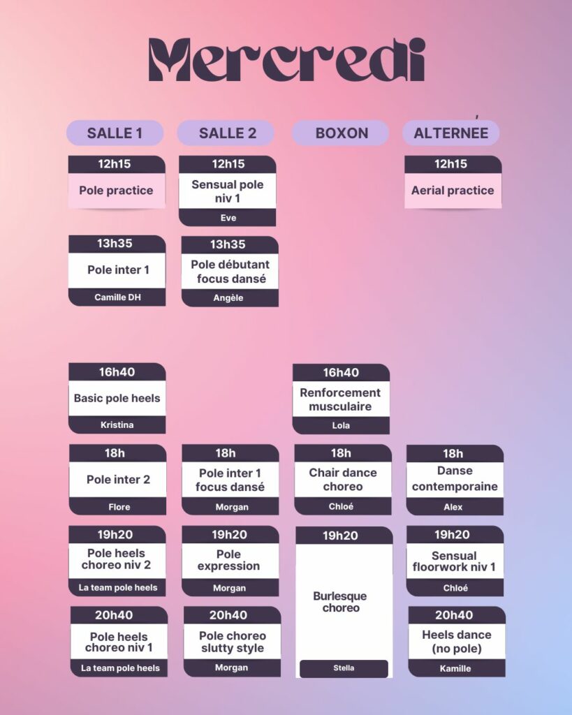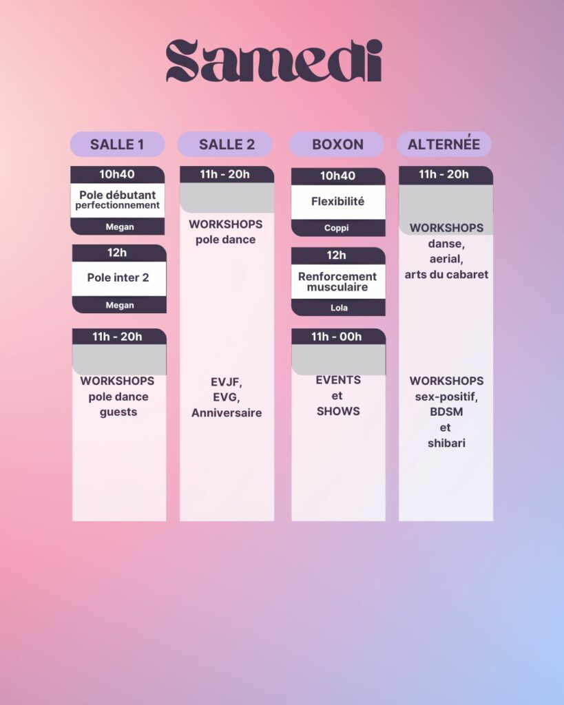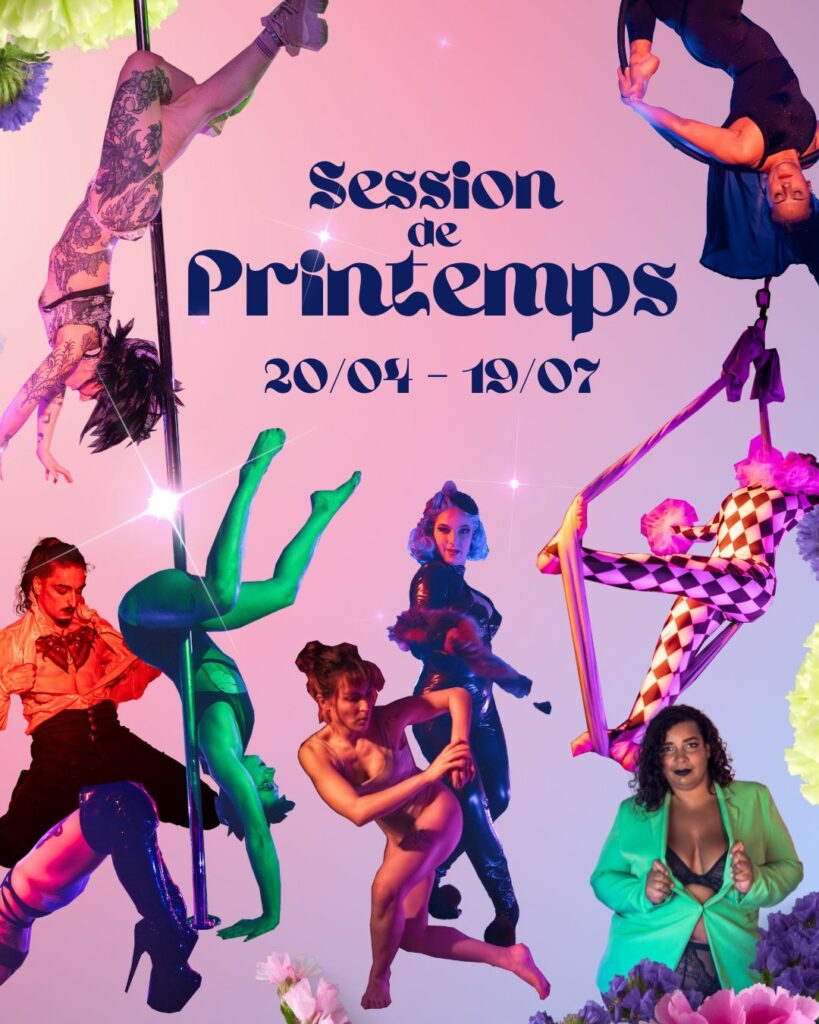 Attention ! Pour les cours de Hammock aérien, Cerceau Aérien, Sensual Floorwork et Pole dance technique et dansée, le programme est étalé sur toute l’année scolaire, il est donc nécessaire de rejoindre le cursus dès le mois de septembre, de le suivre sur les 3 sessions trimestrielles (Automne, Hiver et Printemps), et d’être lae plus régulièr.e possible.