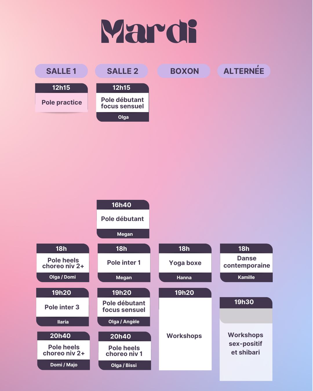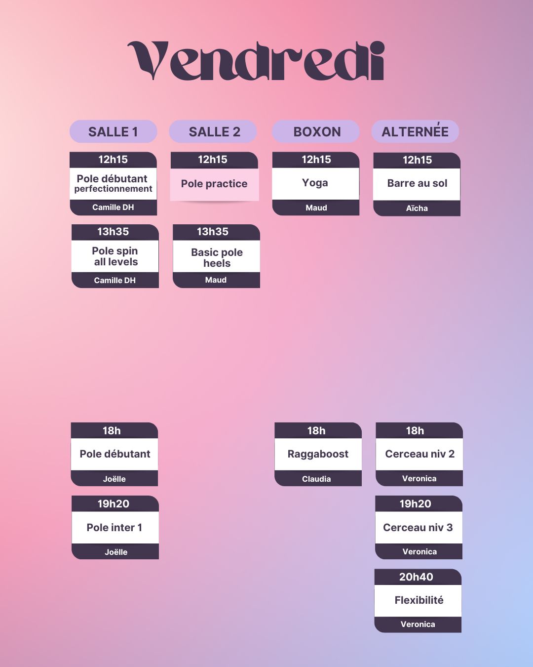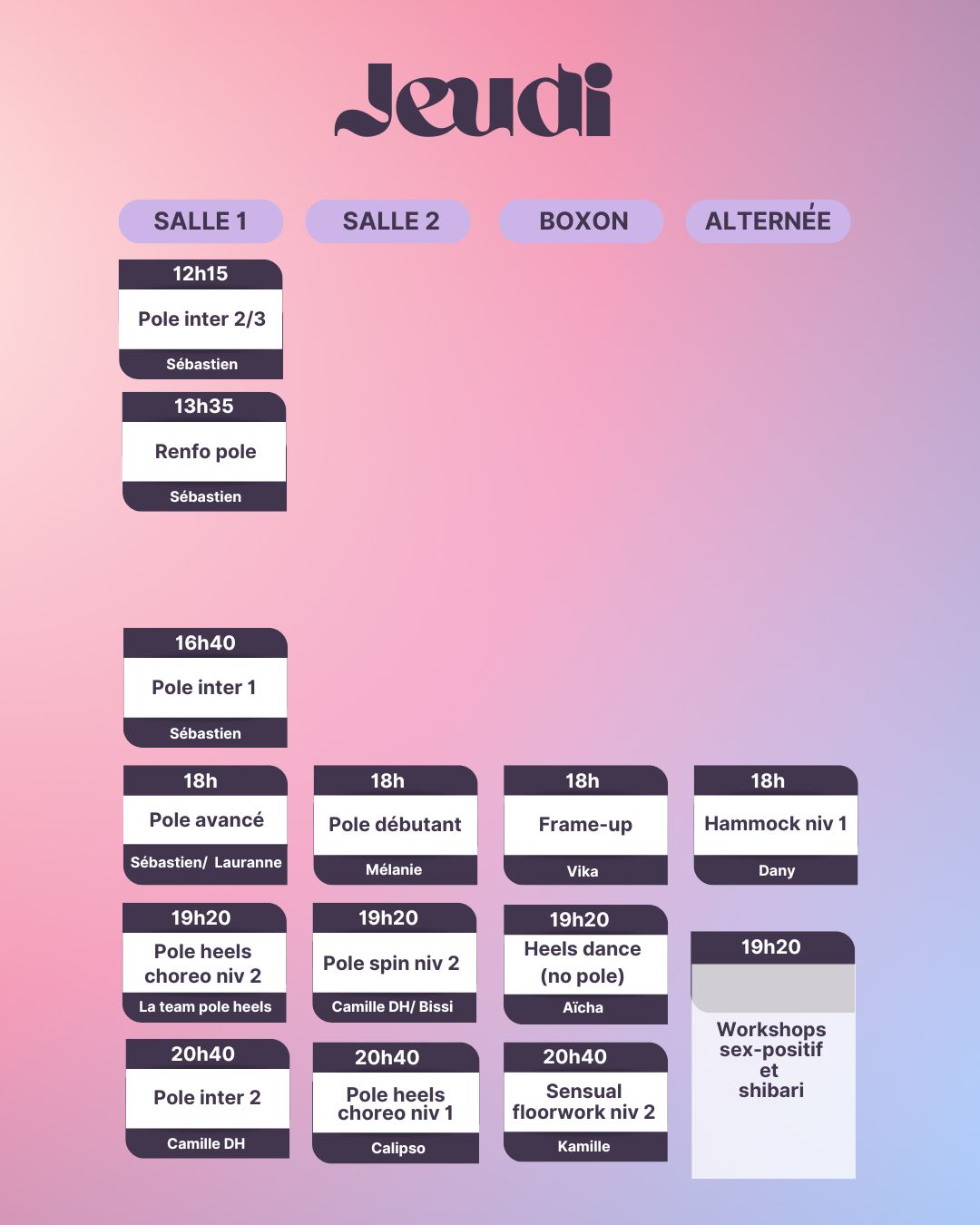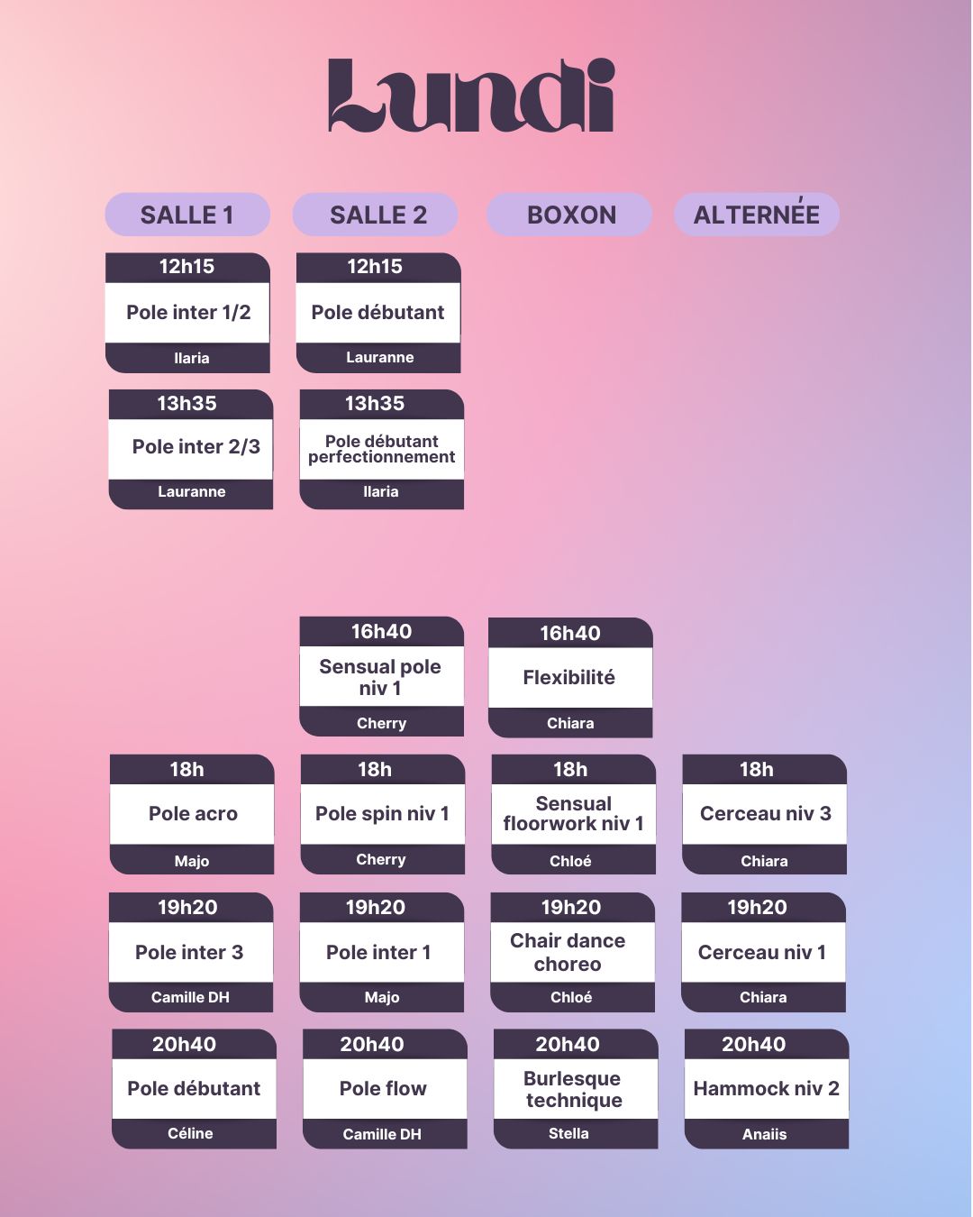 Attention ! Pour les cours de Hammock aérien, Cerceau Aérien, Sensual Floorwork et Pole dance technique et dansée, le programme est étalé sur toute l’année scolaire, il est donc nécessaire de rejoindre le cursus dès le mois de septembre, de le suivre sur les 3 sessions trimestrielles (Automne, Hiver et Printemps), et d’être lae plus régulièr.e possible.